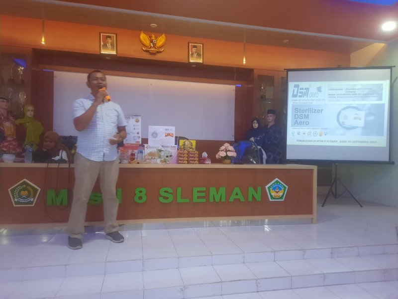 Sleman (MTs N 8 Sleman) – Ozon sterilizer merupakan suatu gas yang sangat reaktif, mudah larut di dalam air dan mudah mengurai menjadi oksigen atau secara mudahnya alat pensteril sesuatu dan menghambat pertumbuhan virus, bakteri, protozoa, dan jamur. Rabu siang (27/9/2023) bertempat di aula madrasah diadakan sosialisasi DSM Aero dari Semarang yang diikuti guru dan pegawai.