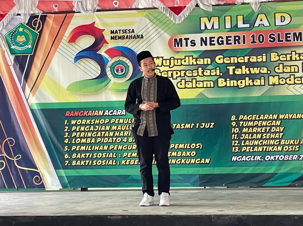 Sleman (MTsN 10 Sleman) Menyambut Bulan Bahasa 2023, MTsN 10 Sleman menggelar Lomba Pidato Empat Bahasa yakni: Pidato Bahasa Indonesia, Bahasa Jawa, Bahasa Arab, dan Bahasa Inggris. Senin (23/10/2023). Lomba digelar serentak di tempat berbeda dalam lingkup MTsN 10 Sleman.. Lomba pidato bahasa Indonesia di Dom MTsN 10 Sleman, bahasa Inggris di Aula Lab IPA, bahasa Arab di Masjid , dan bahasa Jawa di ruang kelas 9a. Masing-masing kelas mengirimkan 2 perwakilan untuk setiap lomba dengan total 96 siswa berpartisipasi mengikuti lomba Pidato Empat Bahasa. Siswa yang tidak mengikuti lomba berpartisipasi menjadi suporter di setiap lomba dan mengisi poling untuk menentukan juara favorit.