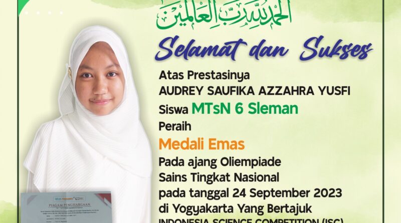 SelengkapnyaSleman ( MTsN 6 Sleman)–Audrey Saufika Azzahra Yusfi siswa kelas 7 MTsN 6 Sleman meraih medali emas dalam Kompetisi Sains