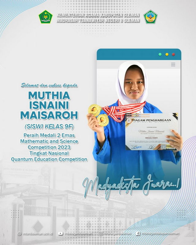 Sleman (MTs N 8 Sleman) – Muthia Isnaini Maisaroh siswa kelas IXF MTs N 8 Sleman berhasil meraih dua medali emas sekaligus dalam Competition 2023 Tingkat Nasional yang diselenggarakan oleh Quantum Education Competition di bidang Mathematic and Science. Keberhasilan ini merupakan prestasi yang luar biasa dan juga menjadi pengalaman yang sangat mengesankan serta dapat menjadi inspirasi teman – temannya dalam mengikuti kompetisi di masa mendatang.