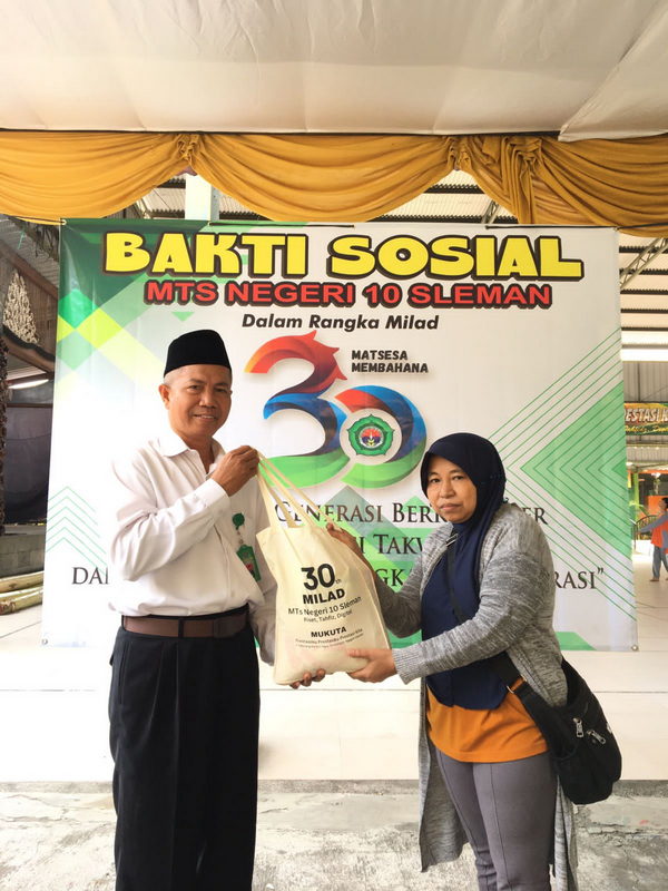 Kepala MTsN 10 Sleman Paijo, S.Ag. , M.P.d.I, bersama panitia berkesempatan menyerahkan langsung kepada pihak yang berhak. “Baksos dimaksudkan sebagai wujud jalinan kasih sayang kami, “ungkap pak Paijo, “Semoga bermanfaat,“ sambungnya.