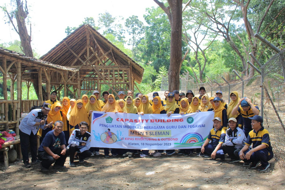Sleman (MTsN 1 Sleman) – Dalam rangka pengembangan kapasitas guru dan pegawai untuk meningkatkan kemampuan baik individu maupun kelompok dari aspek ilmu pengetahuan, ketrampilan, maupun perilaku melalui aktivitas yang menarik, MTsN 1 Sleman menggelar kegiatan outbound di Klaten, Sabtu (18/11/2023). Kegiatan dipandu oleh tim outbound dari Kipas River Tubing berjumlah empat pemandu, dimulai pukul 10.00 dan berakhir pukul 12.00.