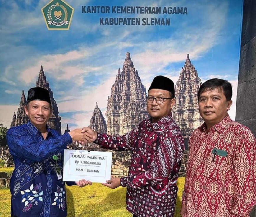 Sleman (MAN 1 Sleman) – Sebagai wujud solidaritas, kepedulian dan keprihatinan terhadap bangsa Palestina yang menjadi korban serangan Israel, MAN 1 Sleman mengumpulkan donasi dari seluruh siswa, guru dan pegawai. Donasi yang terhimpun sejumlah Rp 7.350.000,- diserahkan melalui Kantor Kementerian Agama (Kankemenag) Kabupaten Sleman pada Kamis, (16/11/2023).