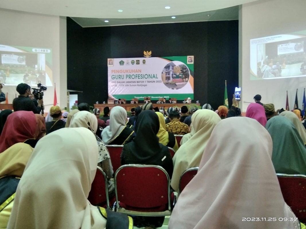 Sleman (MTsN 9 Sleman)- Gedung multi purpose atau yang sekarang disebut dengan gedung Prof.Dr.Amin Abdullah sejak pagi sekitar pukul 07.00 WIB telah dipenuhi dengan para peserta pengukuhan guru profesional batch 1 tahun 2023 LPTK FITK (Fakultas Ilmu Tarbiyah dan Keguruan) UIN Sunan Kalijaga Yogyakarta termasuk guru Bahasa Arab MTsN 9 Sleman,Citra Resmi. Sabtu pagi (25/11/2023) bertepatan dengan Hari Guru Nasional akan menjadi momentum bersejarah bagi 570 guru PAI dan madrasah dari 26 provinsi di Indonesia yang akan dikukuhkan.