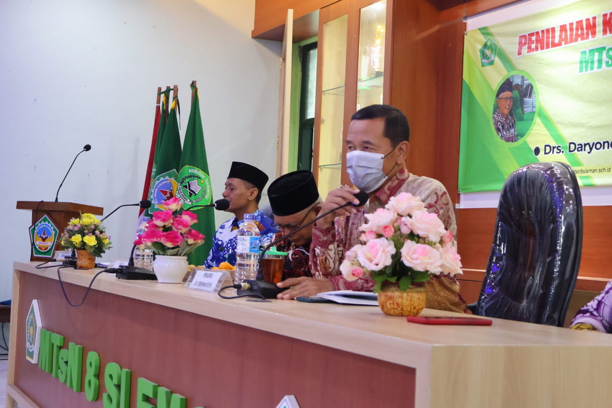 Sleman (MTsN 8 Sleman) – Kegiatan PKKM tahunan di MTsN 8 Sleman pada Senin (30/11/2023) bertempat di aula madrasah dengan tim penilai dari Kantor Kementerian Agama Kabupaten Sleman Drs. Daryono, M.Pd. dan Drs. Mujiyono, M.Pd. Dalam kegiatan ini dimulai dengan pembukaan, menyanyikan Indonesia Raya dan Mars Madrasah, sambutan dari kepala madrasah, sambutan dari tim penilai, dan dilanjutkan dengan penilaian kinerja kepala madrasah, evaluasi atau masukan dari tim penilai, dan terakhir penutup.
