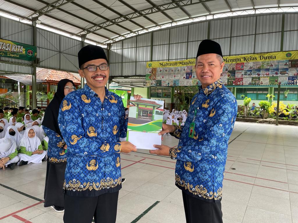 Kepala MTsN 10 Sleman Paijo menyerahkan piagam penghargaan Guru Favorit kepada Exfan Juni