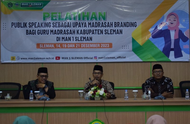 Kepala Kantor Kemenag Sleman, H. Sidik Pramono, M.Si dalam sambutannya berharap agar kegiatan ini dapat membekali para guru dalam membentuk branding madrasah masing-masing. “Saya berharap dengan kemampuan public speaking yang bagus akan dapat membangun citra diri serta citra madrasah di mana bapak/ibu berada, sehingga menjadikan madrasah berkembang semakin baik,” ungkapnya.