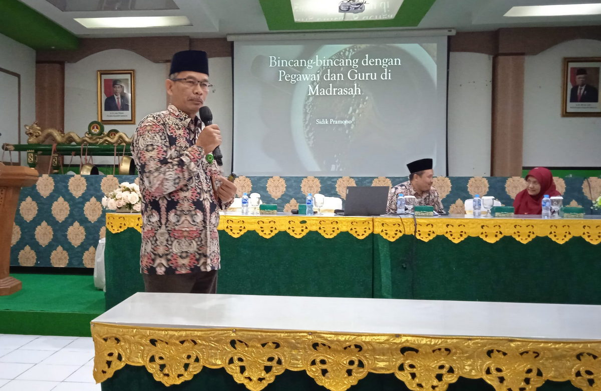 Dengan tema bincang-bincang dengan pegawai dan guru madrasah, Kakan Kemenag mengawali materi dengan mengutip sebuah HR. Muslim no. 1893 tentang keutamaan guru. Lantas membuka sesi diskusi dengan memberikan kesempatan kepada hadirin yang ingin bertanya. Selanjutnya, Sidik mengulas tentang kewajiban PNS, larangan, tingkat dan jenis hukuman disiplin, intimasi hingga problematika madrasah.