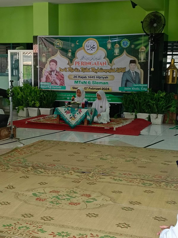 Sleman (MTsN 6 Sleman)- MTsN 6 Sleman menyelenggarakan peringatan Isra Mi’raj Nabi Muhammad 1445 H di Masjid Darul Adzkiya pada Rabu (7/2/2024). Kegiatan diawali dengan pengarahan peserta oleh Wakabid Kesiswaan, Nurhuda Kurniawan, dan dilanjutkan dengan lantunan selawat serta lagu-lagu Islami oleh Hadroh Darul Adzkiya. Tepat pukul 08.00 acara dimulai dipandu oleh Annisa dan Ivy. Keduanya adalah siswa kelas 8 MTsN 6 Sleman yang secara khusus didaulat menjadi pembawa acara pada kegiatan ini.