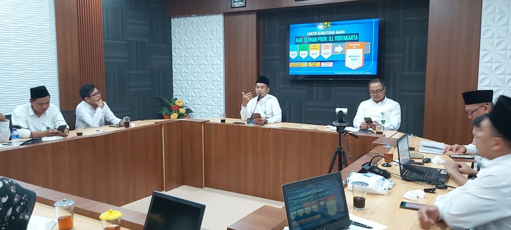 Kepala Kantor Kementerian Agama Kabupaten Sleman H. Sidik Pramono, S.Ag, M.Si pimpin rapat yang dihadiri Kepala Subbag TU, Kepala Seksi, Penyelenggara, Ketua Pokjawas PAI, Ketua Pokjawas Madrasah, Ketua Pokjawas Katolik, Jabfung Analis Kepegawaian, Perencanaan, Pranata Humas, Pengadaan Barjas dan Bendahara.