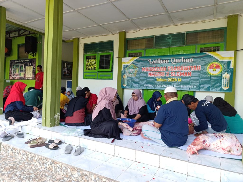 Tepat pukul 07.00 WIB seekor sapi disembelih sebagai rangkaian dari acara latihan kurban di madrasah. Setelah itu, daging sapi langsung diatur untuk dibagikan. Seluruh guru dan pegawai tanpa keraguan terjun langsung dalam pembagian tersebut.Beberapa guru dan pegawai berada di area pemisahan daging dan jeroan, beberapa lainnya bertugas pada penimbangan, sebagian berada pada pengemasan, dan ada pula di titik penyaluran. Kesibukan tersebut terjadi dari pukul 08.00 WIB pasca sapi disembelih hingga berakhir pada pukul 11.00 WIB.