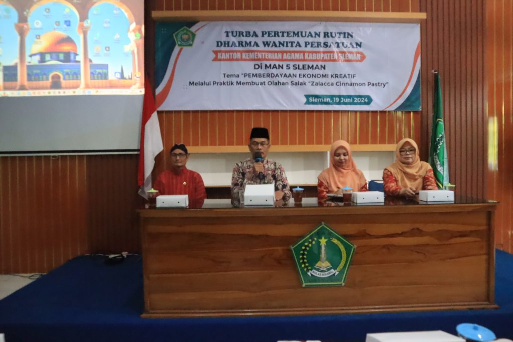Kemenag Sleman News — Madrasah Aliyah Negeri (MAN) 5 Sleman menjadi tuan rumah dalam kegiatan Turba Pertemuan Rutin Dharma Wanita Persatuan (DWP) Kementerian Agama Kabupaten Sleman pada Rabu, (19/6/2024). Acara ini bertempat di AVA dan ruang keterampilan tata boga untuk praktek pembuatan produk boga olahan salak.