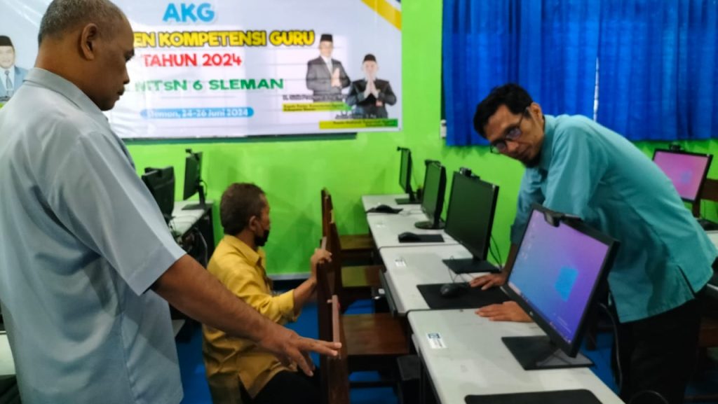 Kemenag Sleman News (MTsN 6 Sleman) — Tim proktor laboratorium komputer MTsN 6 Sleman aktif memeriksa perangkat komputer yang akan digunakan untuk pelaksanaan Asesmen Kompetensi Guru dan Tenaga Kependidikan (AKGTK) pada 24 s.d. 26 Juni 2024. AKGTK dilaksanakan untuk memetakan kompetensi guru, kepala, dan pengawas madrasah sebagai acuan dalam pembinaan dan pengembangan profesi guru, kepala, dan pengawas madrasah, Jumat (21/6/2024).