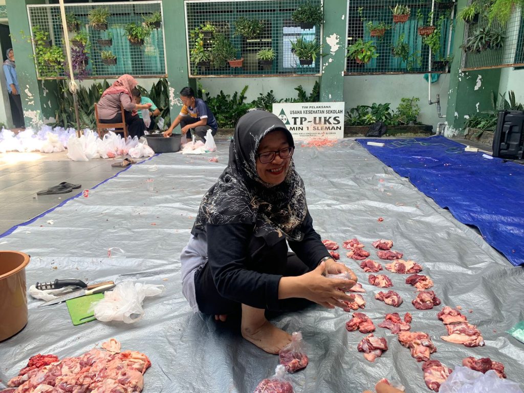 Kepala MIN 1 Sleman bersama dengan beberapa guru, pegawai dan siswa laki-laki kelas 5 secara gotong royong mengurus dan membagi hasil kurban secara merata kepada seluruh keluarga MIN 1 Sleman, baik guru, pegawai serta seluruh siswa-siswi. Kurban juga dibagikan kepada masyarakat sekitar MIN 1 Sleman.