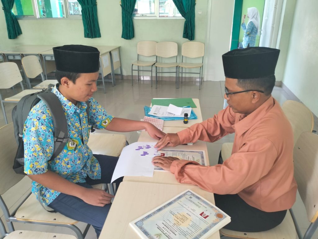 Kemenag Sleman News — (MTsN 9 Sleman)- Pada hari Jumat (21/6/2024) MTs Negeri 9 Sleman menggelar acara penting bagi siswa kelas IX, yaitu pelaksanaan cap tiga jari ijazah. Kegiatan ini berlangsung pada pukul 13.00 WIB dengan dihadiri oleh para siswa kelas IX yang telah menyelesaikan pendidikan di MTs Negeri 9 Sleman. Cap tiga jari ini merupakan salah satu tahapan finalisasi dokumen ijazah sebelum dapat resmi diberikan kepada siswa. Kegiatan cap tiga jari ini berjalan dengan tertib dan lancar, berkat koordinasi yang baik dari para penulis ijazah yang telah menyelesaikan tugasnya secara tepat waktu dengan petugas yang bertanggung jawab dalam kegiatan ini.