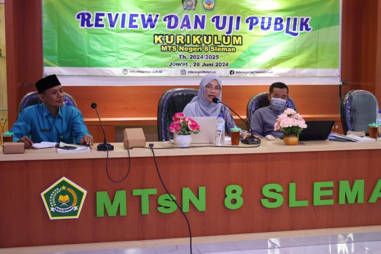 Kemenag Sleman News (MTsN 8 Sleman) – Pada Jumat (28/06/2024), MTsN 8 Sleman menggelar Review dan Uji Publik Kurikulum Madrasah di Aula MTsN 8 Sleman sebagai persiapan Tahun Ajaran 2024/2025. Hadir sebagai penguji adalah Ketua Tim I Kurikulum dan Kesiswaan Kanwil Kementerian Agama Daerah Istimewa Yogyakarta, Hj. Anita Isdarmini, S.Pd., M.Hum., Kepala Seksi Pendidikan Madrasah Kementerian Agama Kabupaten Sleman, Drs. H. Tulus Dumadi, MA, dan Pengawas Pembina MTsN 8 Sleman, Drs. Mujiyono, M.Pd.I. Acara ini juga dihadiri oleh Kepala Madrasah, Kepala Tata Usaha, Ketua Komite, dan seluruh guru MTsN 8 Sleman.