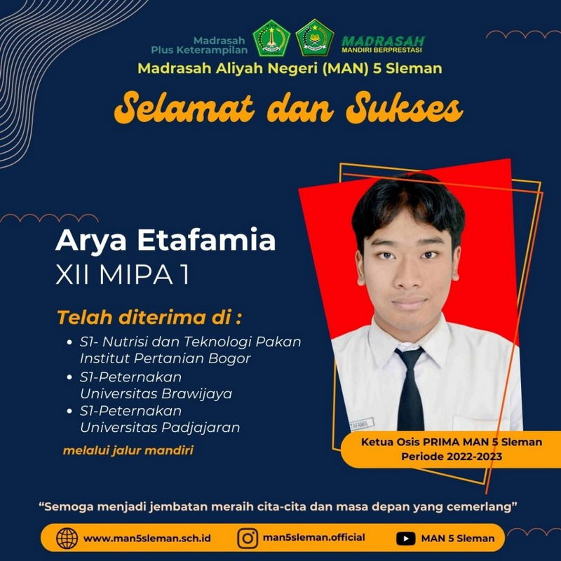 Kemenag Sleman News (MAN 5 Sleman) — Siswa Madrasah Aliyah Negeri 5 Sleman (MAN 5 Sleman), Arya Etafamia berhasil diterima di tiga Perguruan Tinggi Negeri favorit di Indonesia. Padahal persaingan masuk perguruan tinggi tersebut bukan hal yang mudah. Arya lolos seleksi melalui jalur mandiri. Dan pengumuman tersebut secara bersamaan pada Selasa, (09/07/2024) hanya berbeda pada jamnya.
