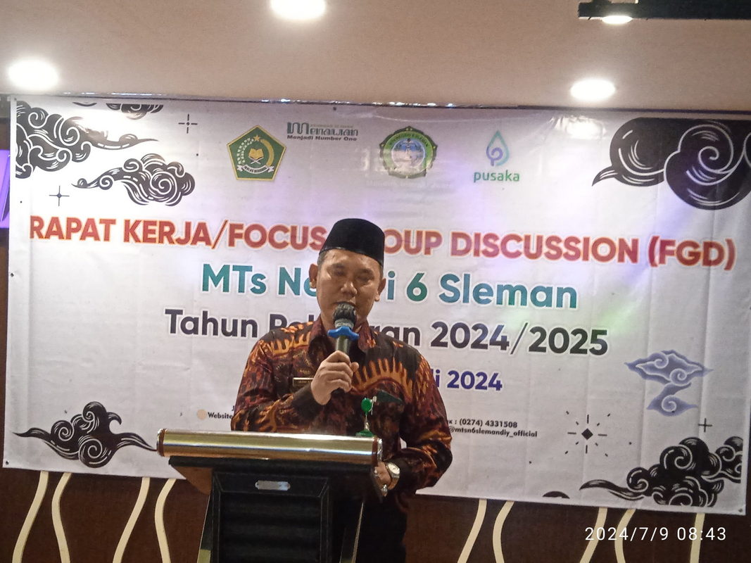 Kankemenag Sleman News (MTsN 6 Sleman) — Focus Group Discussion (FGD) digelar pada hari Selasa (9/7/2024) di Rich Hotel. FGD dihadiri Kepala Kankemenag Sleman, Sidik Pramono, Pengawas Pembina Nur Wahyudin Al Azis, Ketua Komite Qomarizaman dan seluruh Guru ,Tenaga Kependidikan (GTK) MTsN 6 Sleman.