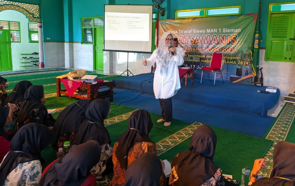 Kemenag Sleman News (MAN 1 Sleman) – Masa Ta’aruf Siswa Madrasah (MATSAMA) di MAN 1 Sleman diisi dengan materi penting terkait Moderasi Beragama, yang disampaikan oleh Wiwin Siti Aminah Rohmawati, M.Ag., pemateri dari Forum Kerukunan Umat Beragama (FKUB) Kanwil Kementerian Agama Daerah Istimewa Yogyakarta (DIY). Acara yang dilangsungkan pada Selasa (16/07/2024) bertempat di Masjid Al Himmah MAN 1 Sleman dan diikuti oleh seluruh siswa baru.