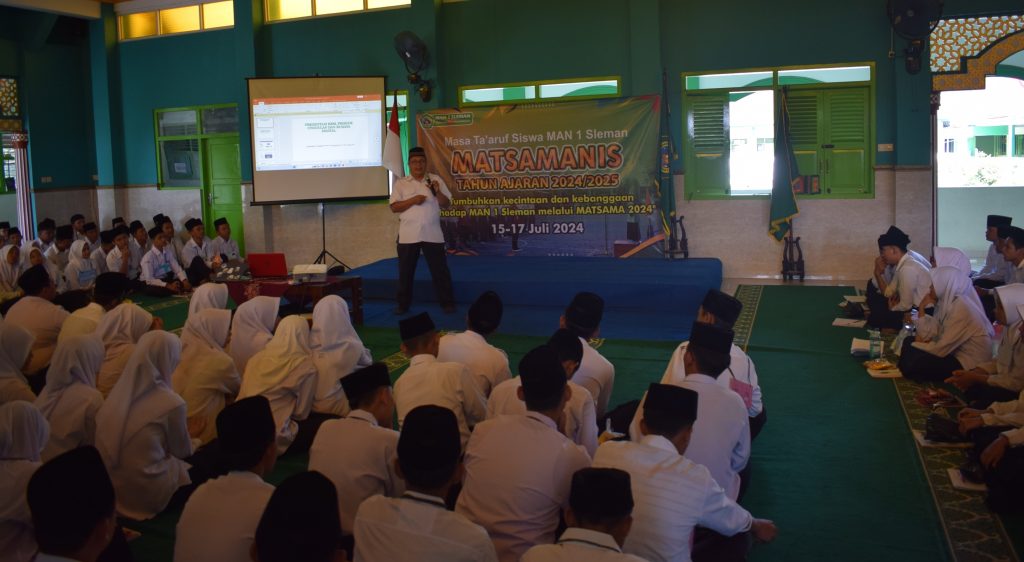 Kemenag Sleman News (MAN 1 Sleman) – Dalam rangka Masa Ta’aruf Siswa Madrasah (Matsama) MAN 1 Sleman, Wakil Kepala Madrasah Bidang Kurikulum, Musahir M.PFis., memaparkan berbagai materi terkait kurikulum dan muatan unggulan, kegiatan belajar mengajar, serta budaya digital pada sesi terakhir yang digelar hari Senin, 15 Juli 2024. Bertempat di Masjid Al Himmah MAN 1 Sleman, seluruh peserta Matsama antusias mengikuti kegiatan yang sudah sedari pagi digelar.