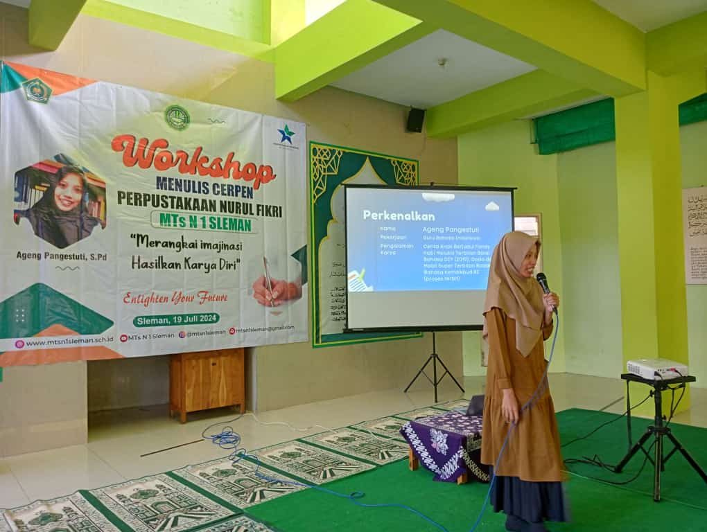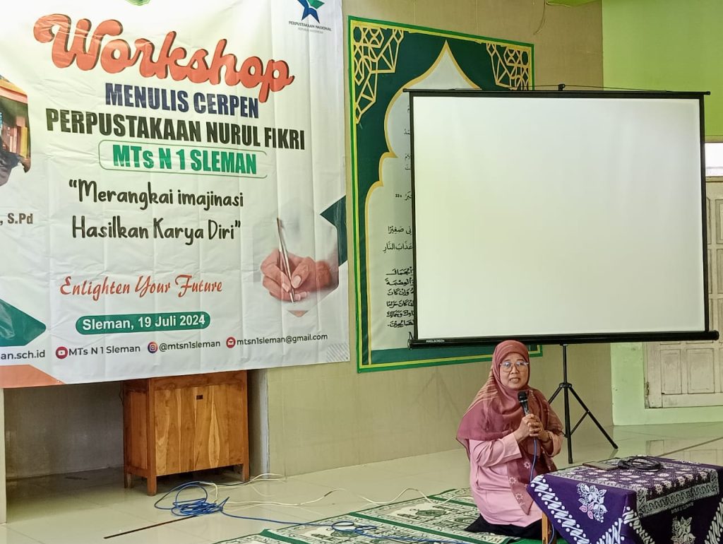 Kemenag Sleman News (MTsN 1 Sleman) – – Dalam rangka peningkatan kompetensi siswa di bidang menulis, Perpustakaan Nurul Fikri MTsN 1 Sleman menggelar Workshop Menulis Cerpen dengan tajuk “Merangkai Imajinasi Hasilkan Karya Diri” pada Jumat (19/7/2024) bertempat di Musala Al Ikhlas dan diikuti oleh 60 siswa perwakilan dari kelas VIII dan IX.  Acara dibuka secara langsung oleh kepala madrasah, Sutarjo  dan didampingi oleh Kepala Perpustakaan Nurul Fikri, Titiek dan guru pendamping. Narasumber kegiatan Ageng Pangestuti, guru Bahasa Indonesia dari MTsN 2 Sleman.