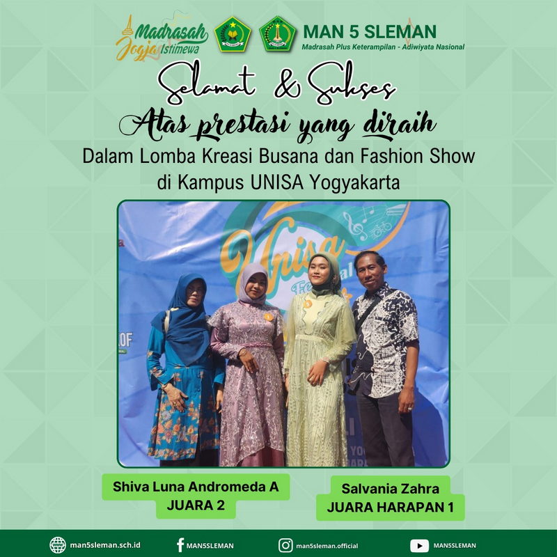Kemenag Sleman News—(MAN 5 Sleman) Dua siswa MAN 5 Sleman raih juara dalam lomba fashion dalam Milad Unisa yang ke 33, Sabtu (20/07/2024). Shiva Luna Andromeda meraih juara 2 dan Salvania Zahra meraih juara harapan 1 dimana keduanya merupakan siswa keterampilan tata busana. Sebelumnya mereka harus menampilkan hasil karya busana mereka dan dinilai oleh dewan juri pada beberapa aspek yakni, kreativitas, kesesuaian tema, keindahan dan kerapihan serta presentasi dan kepercayaan diri.