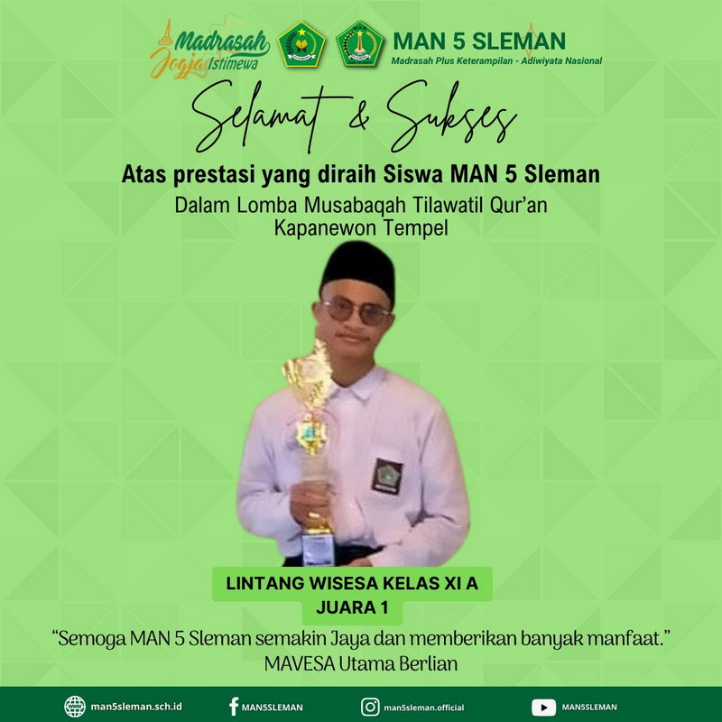 Kemenag Sleman Newsβ(MAN 5 Sleman) Siswa MAN 5 Sleman Lintang Wisesa XI A meraih juara 1 pada kompetisi Musabaqah Tilawatil Qur’an (MTQ) yang diselenggarakan di Kapanewon Tempel pada Selasa, (23/07/2024). Dengan penampilan memukau, Lintang berhasil meraih posisi juara pertama dalam kompetisi yang menampilkan keindahan bacaan Al-Qur’an.