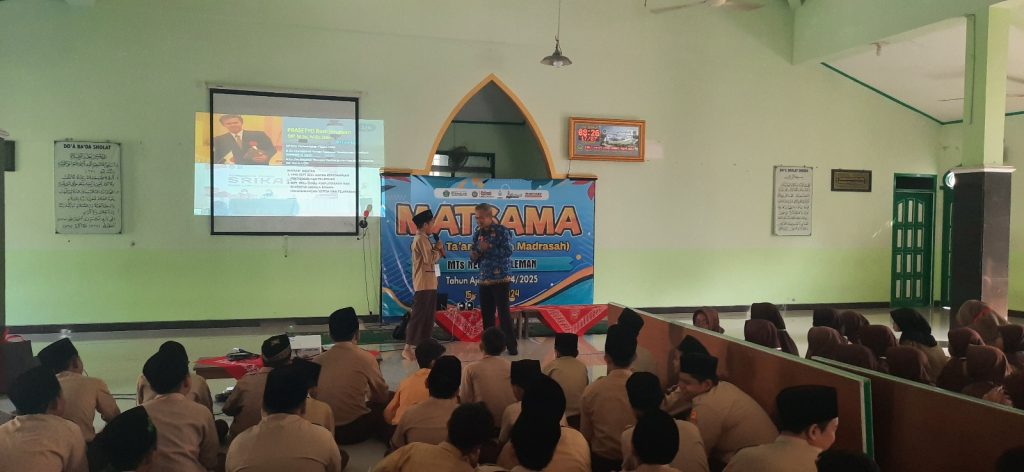 Menghadirkan Kepala Bidang Pengembangan Sistem dan Pelayanan Yuni Prasetyo Budi Ilmawan, S.IP, M.Sc, M.Ec.Dev dan Pustakawan Arif Hidayat, S.IP dari perpustakaan daerah Kabupaten Sleman menjadi narasumber pada kegiatan Masa Ta’aruf Siswa Madrasah (MATSAMA) Tahun Ajaran 2024/2025 di MTsN 4 Sleman, Rabu (17/7/2024).