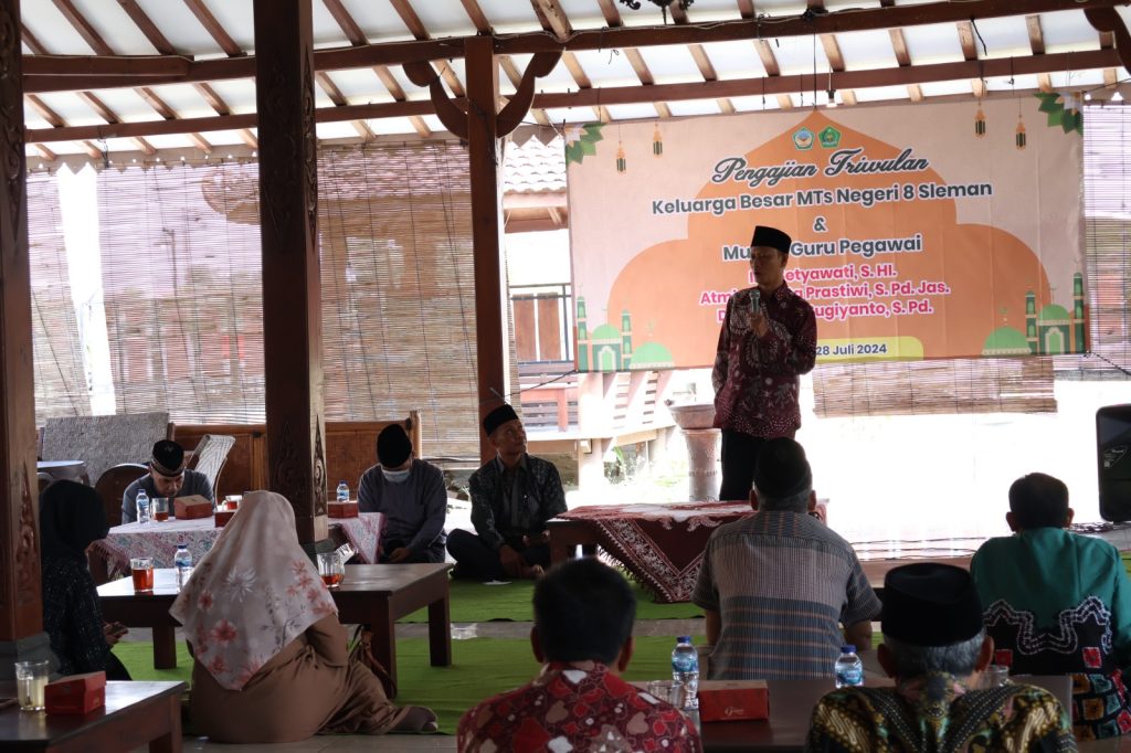 Kepala MTsN 8 Sleman, Agus Sholeh, S.Ag., juga turut memberikan sambutan dalam acara ini. Beliau menyampaikan bahwa pengajian triwulan ini bukan hanya sebagai ajang silaturahmi, tetapi juga sebagai sarana untuk memperkuat iman dan taqwa seluruh keluarga besar MTsN 8 Sleman. “Dengan menjaga silaturahmi, kita berharap dapat memperoleh keberkahan dalam setiap langkah dan aktivitas kita, baik di lingkungan sekolah maupun dalam kehidupan sehari-hari,” ujar Agus Sholeh.