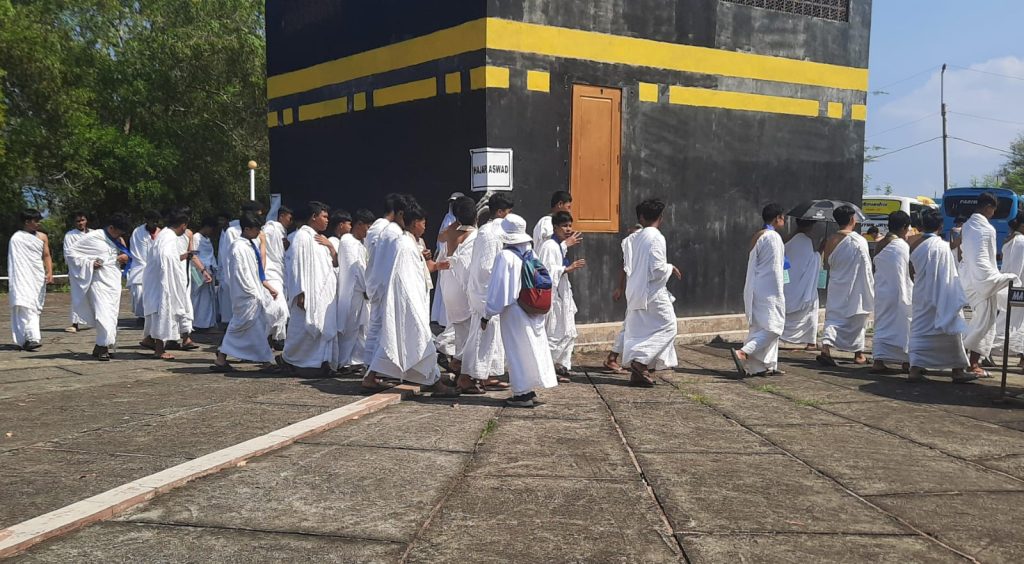 Para siswa yang terbagi dalam beberapa regu dan rombongan mengenakan pakaian ihrom serba putih, berangkat ke tempat kegiatan menggunakan bus. Di dalam bus para siswa mulai melakukan niat haji dan memperbanyak talbiyah. Sesampai di lokasi miniatur manasik haji, rombongan mulai melakukan serangkaian praktik manasik haji mulai dari simulasi wukuf, mabit di Musdzalifah dan Mina, melempar jumroh, thawaf, sa’i dan tahalul. Para siswa juga membaca do’a-do’a selama melakukan simulasi tersebut.