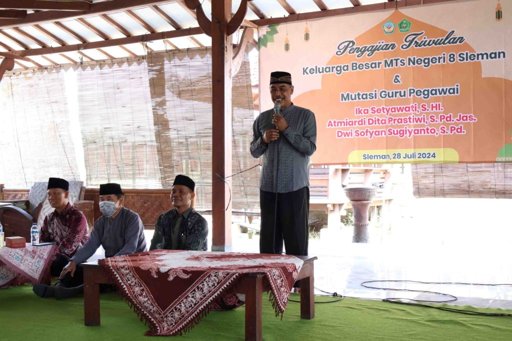 Kemenag Sleman News (MTsN 8 Sleman) – Ketua Komite MTs Negeri 8 Sleman, Tyas Endarto Budi Prayitno, S. Ag., memberikan sambutan hangat dalam pengajian rutin triwulan yang dilaksanakan pada Minggu (28/7/2024) di Rumah Makan Sego Kembul. Pengajian ini dihadiri oleh keluarga besar MTs Negeri 8 Sleman beserta pengawas Kabupaten Sleman Drs. Mujiono M.Pd.I dan mitra kerja MTs Negeri 8 Sleman Wahyu Wododo.