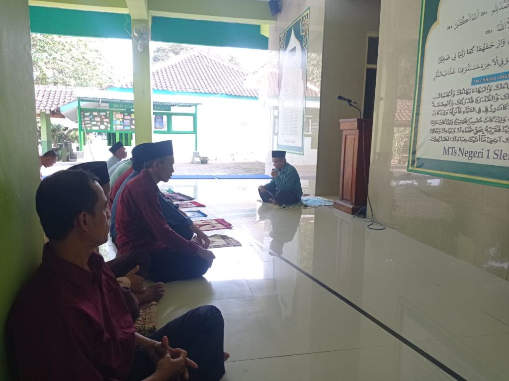 Sleman (MTsN 1 Sleman) – Jumat ( 2/8/ 2024), MTs Negeri 1 Sleman melaksanakan kegiatan pembiasaan membaca Asmaul Husna setelah salat Asar. Kegiatan ini diadakan di musala madrasah dan dipimpin langsung oleh Irhanudin guru Fikih dan imam salat Asar. Acara dihadiri oleh guru dan pegawai.