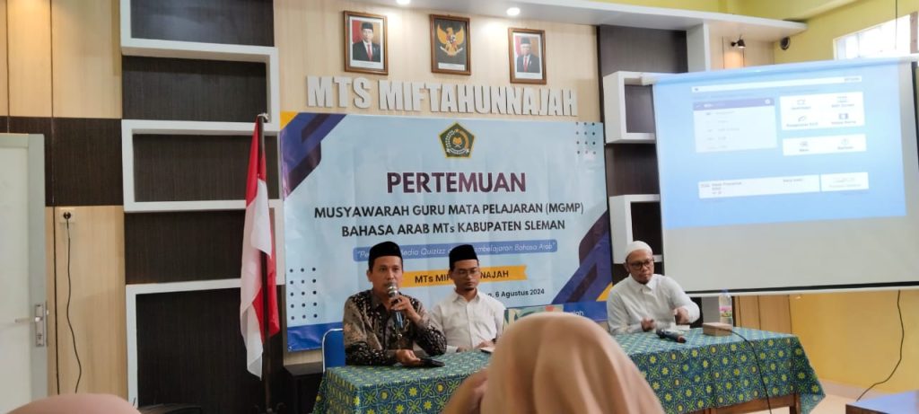 Kemenag Sleman News (MTsN 9 Sleman) — Dua guru Bahasa Arab dari MTsN 9 Sleman yakni Elva Lutfiyati dan Citra Resmi turut berpartisipasi dalam kegiatan Musyawarah Guru Mata Pelajaran (MGMP) Bahasa Arab tingkat MTs se-Kabupaten Sleman. Acara tersebut diselenggarakan pada hari Selasa (6/8/2024) bertempat di ruang aula Pondok Pesantren Miftahunnajah, Gamping, Sleman.