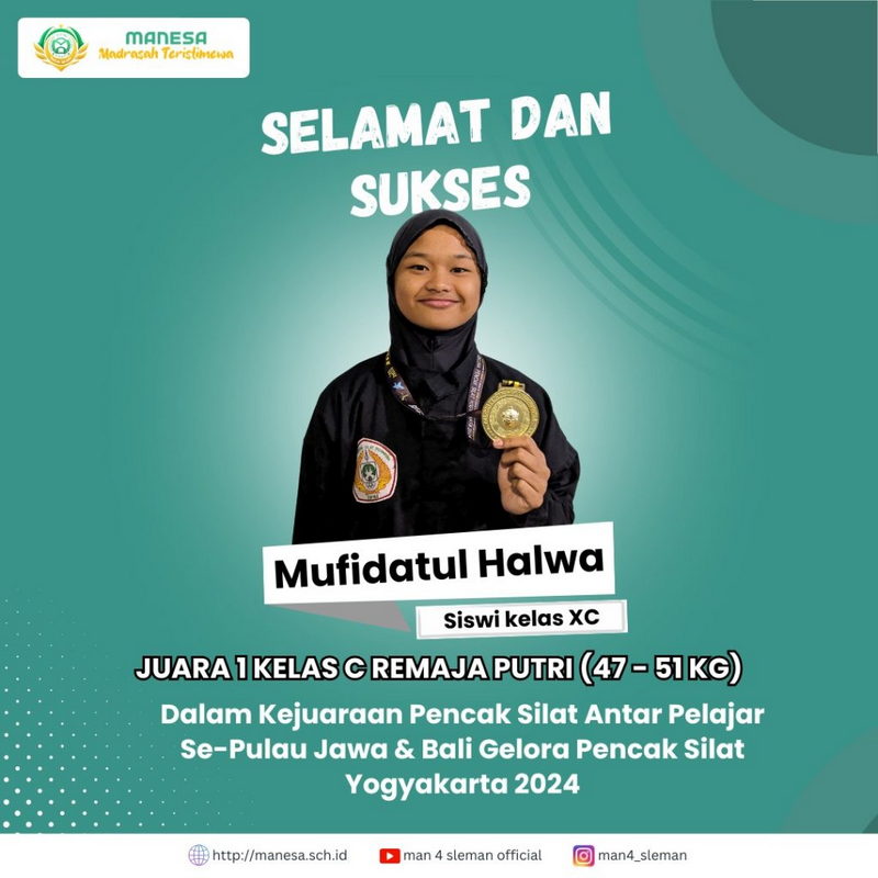 Kemenag Sleman News (MAN 4 Sleman) — Prestasi gemilang kembali ditorehkan oleh Mufidatul Halwa, siswi MAN 4 Sleman, yang berhasil meraih Juara 1 di Kelas C Remaja Putri (47-51 KG) pada Kejuaraan Pencak Silat Antar Pelajar se-Pulau Jawa & Bali, Gelora Pencak Silat Yogyakarta Tahun 2024. Kompetisi bergengsi ini berlangsung pada 8-10 Agustus 2024 di GOR Among Raga, Umbulharjo, Kota Yogyakarta.