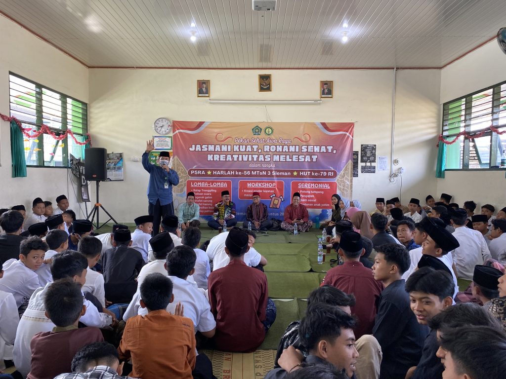 Kemenag Sleman News(MTsN 3 Sleman)_Hari terakhir Proyek Penguatan Profil Pelajar Pancasila Rahmatan lil Alamin (P5RA) tahun pelajaran 2024/2025 yang masih menyatu dengan peringatan HUT ke-79 RI dan perayaan Hari Lahir ke-56 MTsN 3 Sleman dilaksanakan di aula pada Jumat, 16/8/2024. Bangunlah Jiwa dan Raganya menjadi tema kali ini.