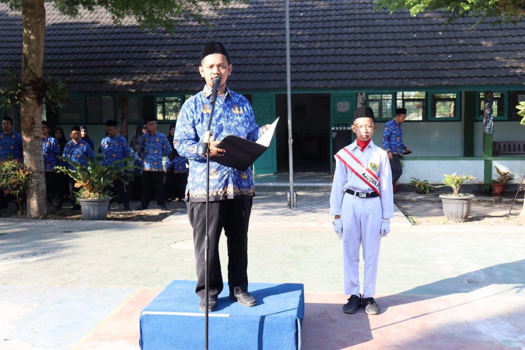 Kemanag Sleman News (MTsN 7 Sleman) – Suana khidmat dan penuh semangat naionalisme tergambar dalam kegiatan upacara peringatan Hari Ulang Tahun (HUT) Republik Indonesia ke-79 di Lapangan Basket MTsN 7 Sleman, Sabtu (17/8/2024). Kegiatan ini diikuti oleh seluruh bapak ibu guru pegawai serta peserta didik 7, 8, dan 9. Dalam upacara kali ini juga diikuti bapak ibu pegawai KUA Kepanewon Pakem yang kebetulan kantornya terletak bersebelahan dengan komplek MTsN 7 Sleman. Bertugas sebagai pembina upacara Randat Pratikawa, S.Pd. selaku guru Seni Budaya, sedangkan Bayu Hastomo Karyo, S.Pd. ditunjuk untuk membacakan Teks Proklamasi. Petugas pengibar bendera yaitu peserta didik kelas 9 C serta petugas lainnya yang telah dipersiapkan sejak awal.