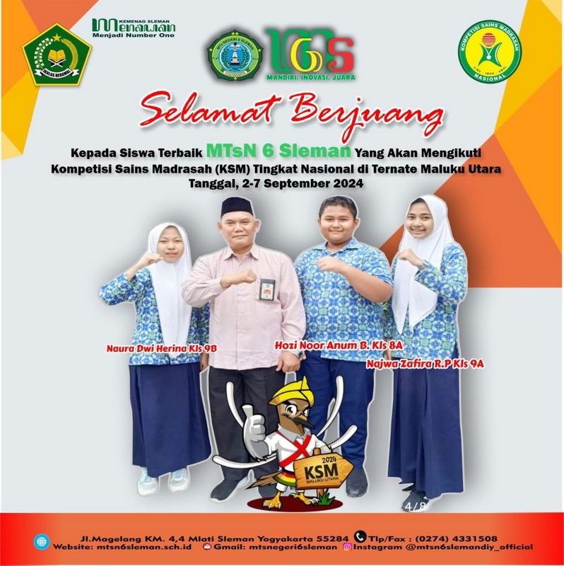 Tim KSM Beregu dari MTsN 6 Sleman siap bertolak ke Ternate bersama Saptini sebagai pembimbing teknis dan Jazim Kholis selaku Kamad yang memang memiliki undangan khusus sebagai madrasah peserta pada ajang final KSM. Dalam kurun dua pekan terakhir, Hozi-Naura-Zafira, anggota tim KSM Beregu, mengikuti bimbingan KSM secara rutin bersama pembimbing dan rela meninggalkan pembelajaran di kelas.