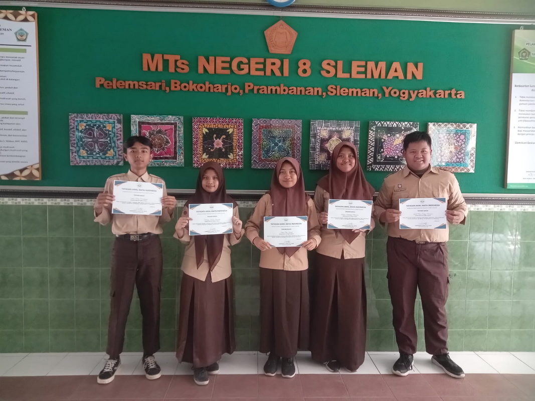 Kemenag Sleman News (MTsN 8 Sleman) – Lima pengurus OSIS MTsN 8 Sleman menerima sertifikat penghargaan dari Yayasan Amal Mata Indonesia atas partisipasi mereka dalam mendukung suksesnya program bantuan kacamata bagi siswa yang membutuhkan. Sertifikat ini ditanda tangani oleh Subandriyo, B.B.A., S.H., M.Pd., Country Director Yayasan Amal Mata Indonesia, pada Jumat (06/09/2024) di PTSP MTsN 8 Sleman.
