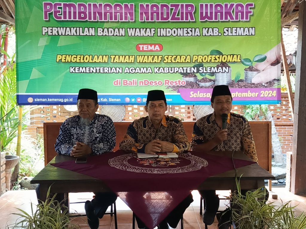 Kemenag Sleman News— Untuk meningkatkan kualitas peran Nazhir, Perwakilan Badan Wakaf Indonesia (BWI) Kabupaten Sleman, bekerjasama dengan Kantor Kementerian Agama Kabupaten Sleman (Kemenag Sleman) menyelenggarakan kegiatan Pembinaan Nazhir Wakaf dengan mengusung tema “Pengelolaan Tanah Wakaf Secara Profesional” bertempat di Bale nDeso Komplek Kampung Flory Plaosan Tlogoadi Sleman, Selasa (10/09/2024).