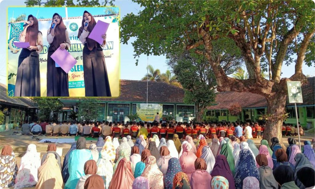 Kemenag Sleman News (MTsN 1 Sleman) – Dalam rangka memperingati Maulid Nabi Muhammad SAW, MTsN 1 Sleman menggelar acara yang diikuti oleh siswa kelas 7, 8, dan 9 di halaman madrasah. Salah satu momen istimewa pada acara tersebut adalah pembacaan puisi yang dibawakan oleh tiga siswi berbakat, yaitu Salwa (kelas 9A), Arza (kelas 9A), dan Fani (kelas 8A).