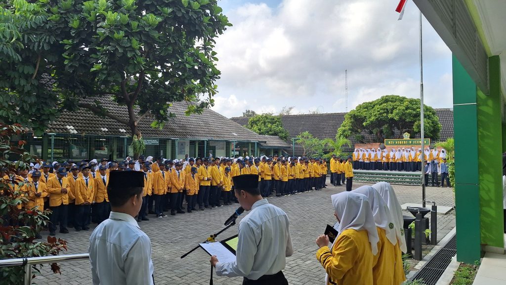 Kemenag Sleman News (MTsN 9 Sleman) – Selasa (01/10/24) seluruh warga Madrasah Tsanawiyah Negeri 9 Sleman melaksanakan upacara peringatan Hari Kesaktian Pancasila di halaman Madrasah. Upacara ini diikuti oleh siswa, guru, dan staf Madrasah sebagai bentuk penghormatan terhadap nilai-nilai Pancasila. Upacara dimulai pukul 07.00 WIB, bertindak sebagai pemimpin upacara yakni Zaki; petugas pengibaran bendera yakni Dion, Yudha dan Zora; pembawa acara atau selaku MC Najwa dan Aisyah; yang membacakan UUD 1945 yakni Hanifiyana, pleton 1 yakni Ardian, Pleton 2 Faras dan pleton 3 yakni nabila. Petugas Dirijen dan paduan suara yakni Osis MTsN 9 Sleman. Pembawa pancasila yakni Fernanda. Dan pembacaan doa dibawakan oleh Bisri Mustofa.