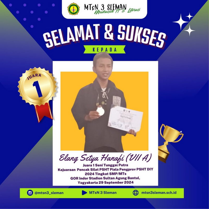 Kemenag Sleman News (MTsN 3 Sleman)–Elang Setya Hanafi berhasil meraih juara 1 Kejuaraan Pencak Silat PSHT Piala PENGPROV PSHT DIY 2024 dalam kategori Seni Tunggal Putra Tingkat SMP/MTs. Siswa Kelas VII A MTsN 3 Sleman ini berhasil mengungguli peserta lainnya dengan perolehan nilai 97,70. Elang unggul dalam aspek gerakan, tenaga maupun ekspresi. Untuk menghadapi kejuaraan yang digelar di GOR Indoor Stadion Sultan Agung Bantul Pada tanggal 28-29 September 2024 tersebut Elang telah mempersiapkan latihan intensif.