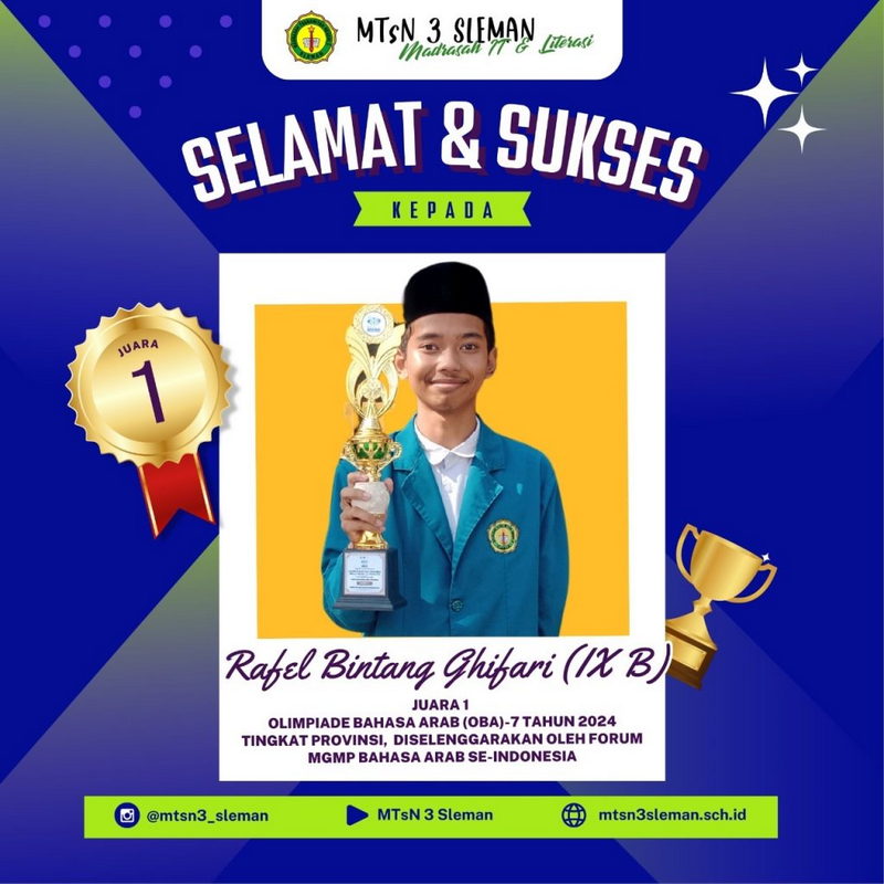 Dengan prestasi ini, MTs Negeri 3 Sleman kembali menunjukkan kualitasnya dalam mencetak generasi yang unggul, khususnya dalam bidang Bahasa Arab. Seluruh warga madrasah berharap agar prestasi ini dapat menjadi inspirasi bagi siswa lainnya untuk terus berusaha dan berprestasi. (hil)