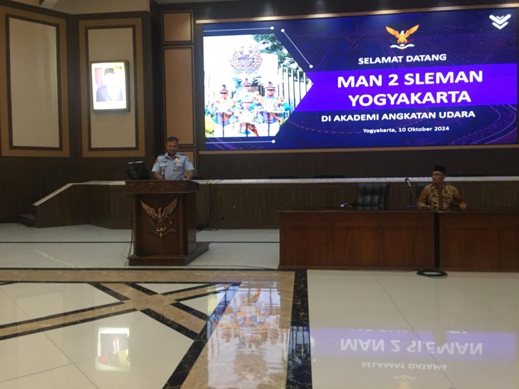 “Selamat datang siswa pengurus MPS dan OSIS MAN 2 Sleman. Kalian merupakan generasi muda Generasi Muda yang bisa diharapkan untuk melanjutkan pembangunan menuju Indonesia maju. Mereka Generasi Muda yang cerdas, tidak mudah menyerah. Mereka inilah calon-calon pemimpin negeri ini yang akan mengharumkan Negara NKRI di kancah dunia.” Ucap Marsekal Muda TNI Dr. Ir. Purwoko Aji Prabowo, M.M., MDS.