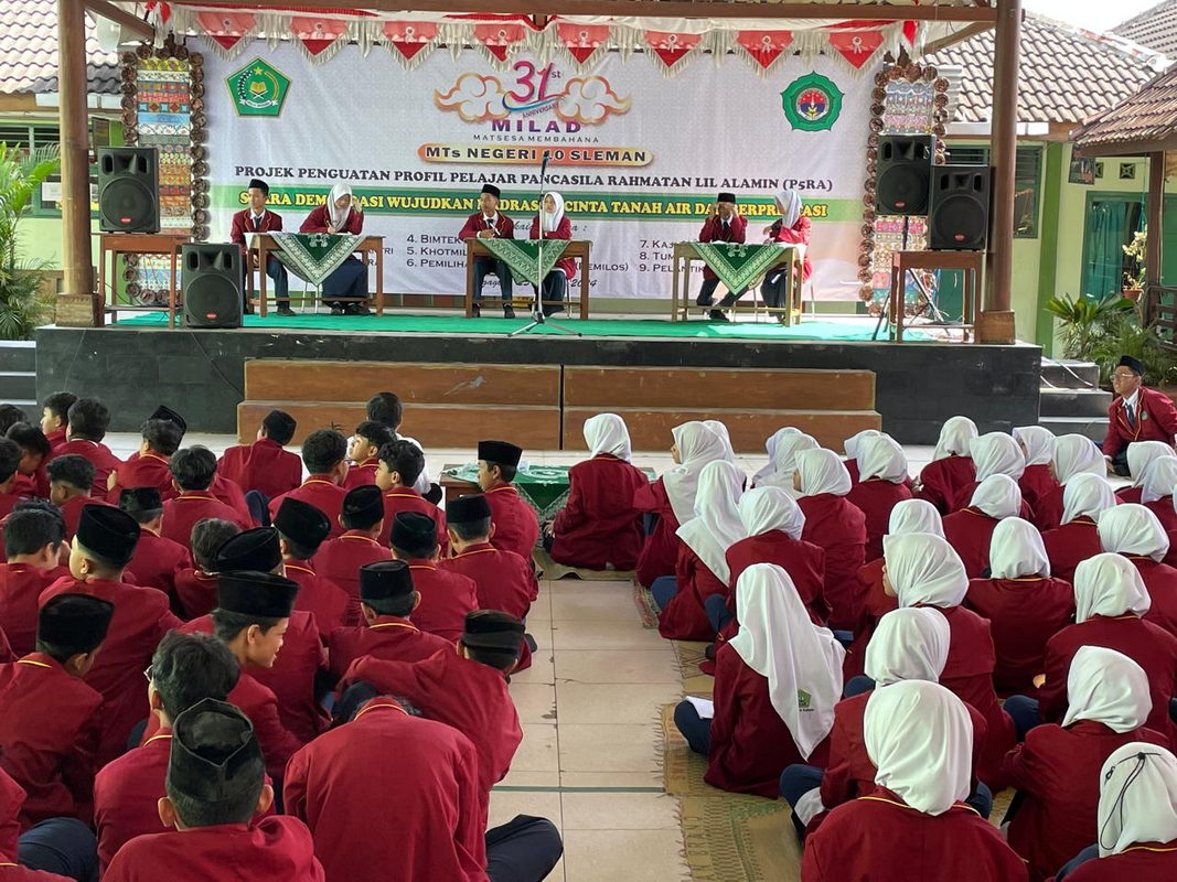 Kemenag Sleman News (MTsN 10 Sleman) Penjaringan Pasangan Calon (Paslon) Ketua dan pengurus OSIS MTsN 10 Sleman (Matsesa) memasuki fase orasi Paslon, Senin (22/10/ 2022). Dome Matsesa didesain mirip area debat calon pemimpin bangsa. Di atas panggung terdapat 3 set meja kursi untuk 3 paslon kandidat ketua dan wakil ketua OSIS. Di samping kanan Ketua Panitia Pemungutan Suara (PPS) dan tim mengatur jalannya orasi. Samping kiri panggung duduk rapi calon pengurus OSIS. Depan panggung KPPS tak kalah sibuk mengatur jalannya orasi. Sementara itu, di depan panggung, duduk dengan tertib rakyat calon pemilih kelas 7, 8, dan 9 serta guru dan pegawai serius menyimak.
