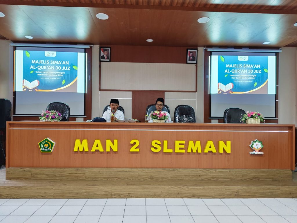 Kemenag Sleman News (MAN 2 Sleman) – Peringatan Hari Santri Nasional digelar tiap tahunnya pada tanggal 22 Oktober. Guna menanamkan ruh pesantren di lingkungan madrasah MAN 2 Sleman menyelenggarakan sima’an Qur’an. Sima’an Qur’an diselenggarakan di Masjid Baitul Mutaallimin dan Aula MAN 2 Sleman pada Selasa (22/10/2024).