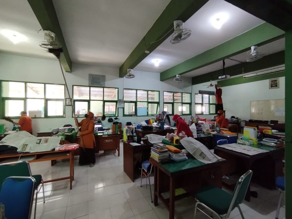 Para guru dan pegawai menyisir setiap sudut ruang kelas, kantor, hingga area terbuka yang masih terlihat kotor atau berantakan. Mereka bekerja sama untuk membersihkan lantai, merapikan perabot, dan menyingkirkan barang-barang yang tidak terpakai. Suasana kerja bakti berlangsung aktif dan penuh kekeluargaan, dengan masing-masing peserta bahu-membahu menyelesaikan tugas.