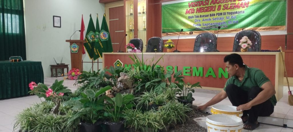 Kemenag Sleman News – (MTsN 8 Sleman) Dalam rangka menyambut visitasi akreditasi, MTsN 8 Sleman melakukan berbagai persiapan agar proses penilaian berjalan lancar. Salah satu fokus utama adalah menata tempat visitasi menjadi lebih nyaman dan asri. Tim dekorasi MTsN 8 Sleman, yang dipimpin oleh Rochmad Rapih Raharjo, S.Pd., berupaya menghadirkan suasana yang nyaman dengan sentuhan taman kecil di aula madrasah.