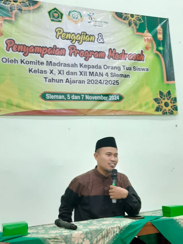 Kepala MAN 4 Sleman, Drs. Ahmad Arif Makruf, MA., M.Si., menyampaikan apresiasi yang sebesar-besarnya kepada orang tua wali siswa yang telah berpartisipasi, memberikan amanah, dan dukungan kepada madrasah. Beliau mengungkapkan bahwa madrasah ini terus berupaya melengkapi sarana dan prasarana pendukung pendidikan, serta menjalankan program penguatan karakter dan akhlakul karimah.