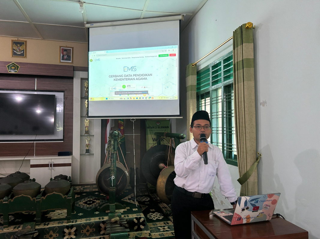 Materi sosialisasi disampaikan oleh Sutanto, S.Pd.Si., seorang guru di MTsN 2 Sleman yang memiliki pemahaman mendalam tentang EMIS. Dalam pemaparannya, Sutanto menjelaskan fungsi, cara kerja, serta pentingnya pengisian data yang akurat di EMIS untuk mendukung administrasi diri di bawah naungan Kementerian Agama.